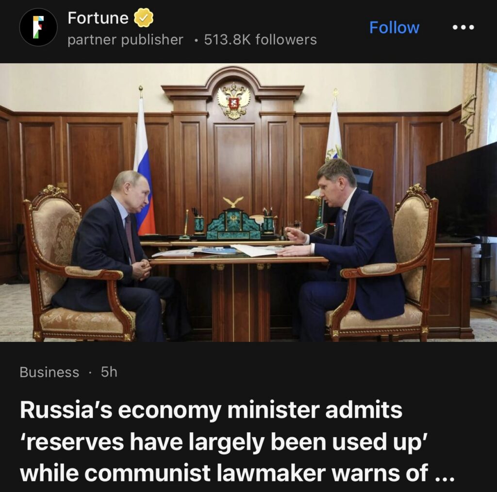 4。据Fortune报道,俄罗斯经济部长承认“储备已基本耗尽”,与此同时,一位共产党议员发出警告:随着GDP萎缩,一场1917年式的革命恐将爆发。