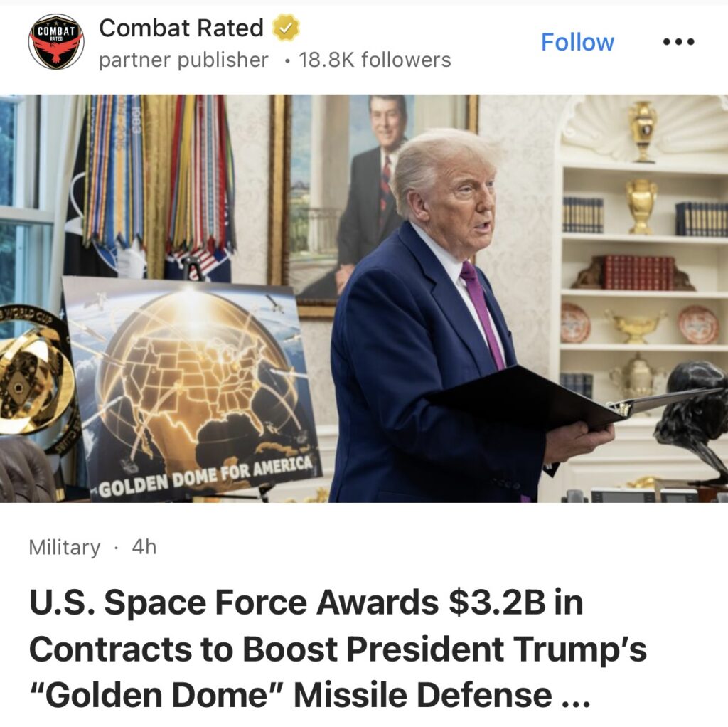 11。据Combat Rated 周日报道,美国太空军授出32亿美元合同,以推动特朗普总统的“金穹顶”导弹防御计划。