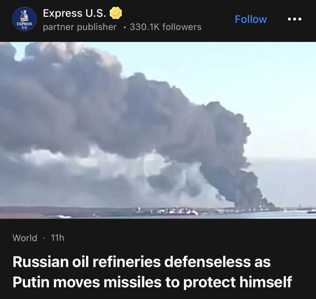 1。据Express U.S.周六报道,普京调动导弹自保,俄罗斯炼油厂陷入无防卫境地。