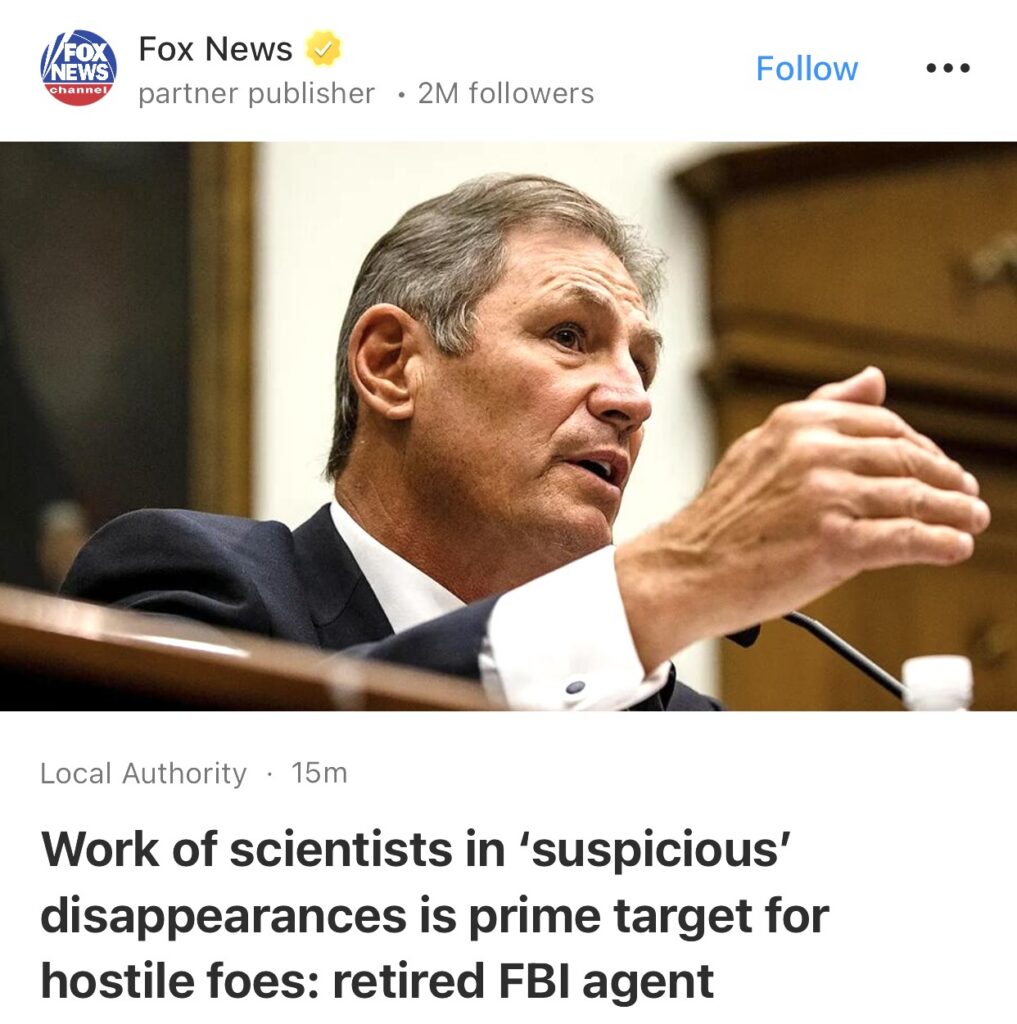 15。据Fox News 周日报道,退休联邦调查局(FBI)探员指出:科学家针对“可疑”失踪事件开展的工作,是敌对势力的首要攻击目标。