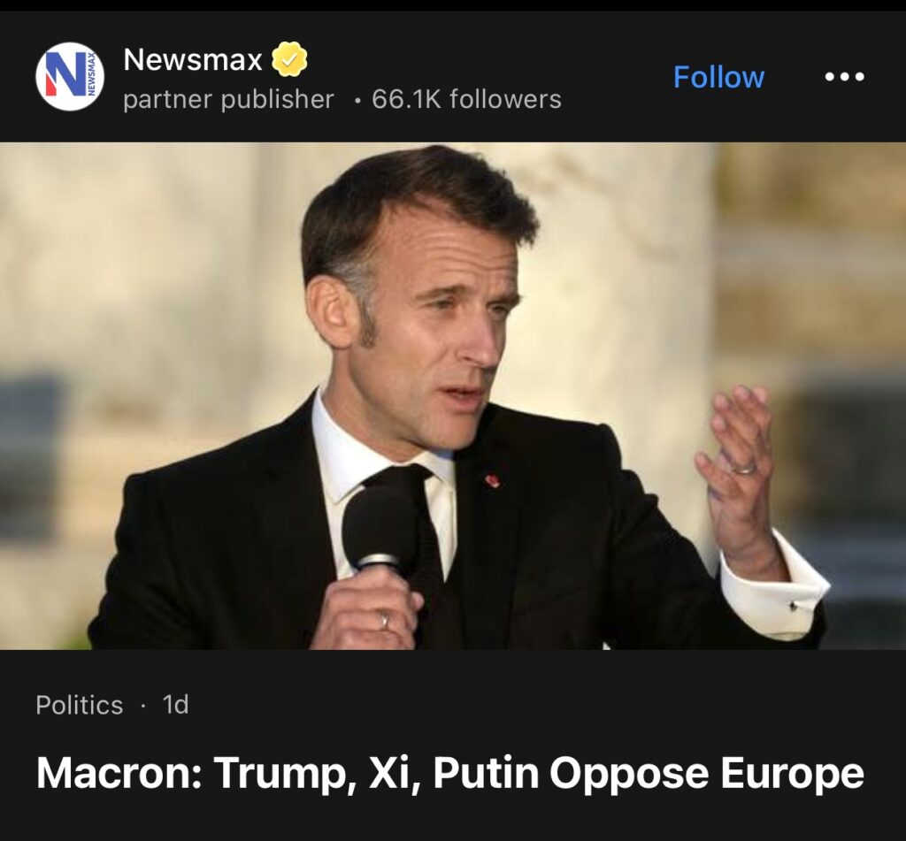 10。据Newsmax 周五报道。法国总统埃马纽埃尔·马克龙周五发出警告称,美国总统唐纳德·特朗普、中国国家主席习近平以及俄罗斯总统弗拉基米尔·普京,正身处一场不利于欧洲的全球性变局之中。