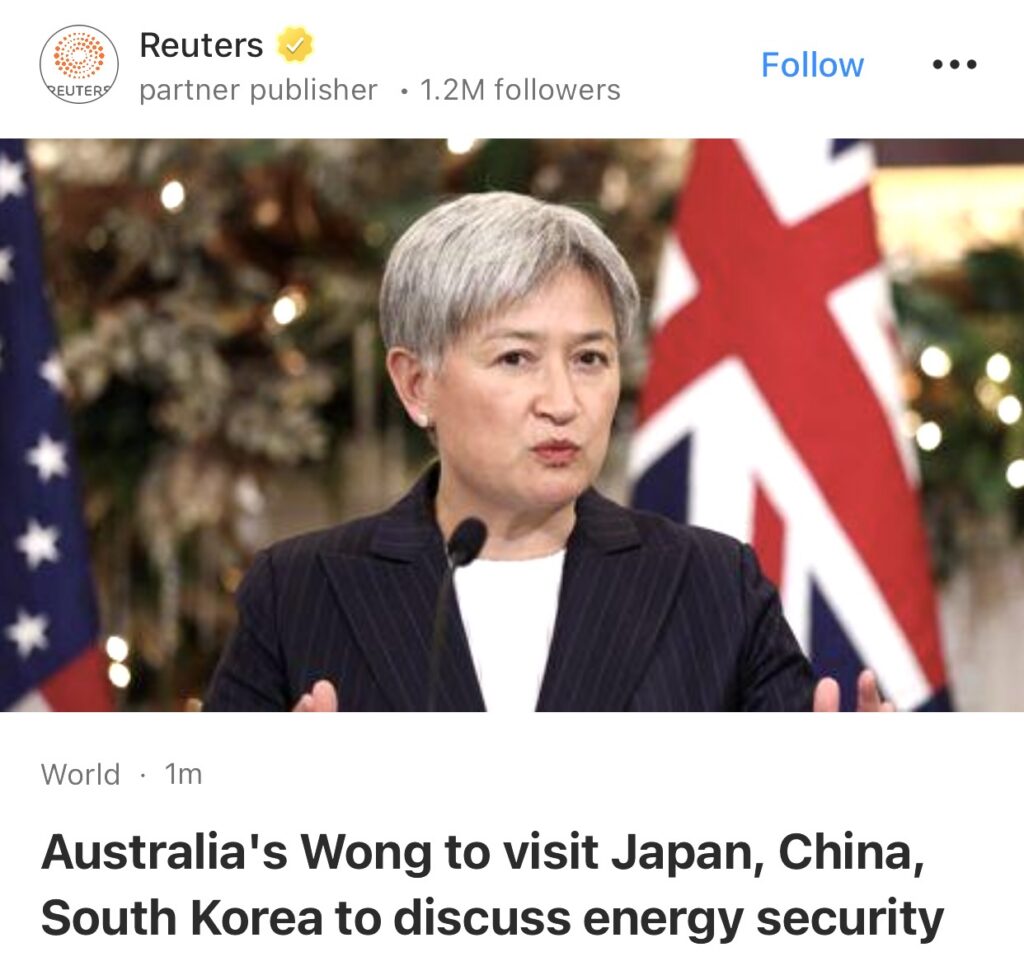 14。悉尼,4月26日(路透社)——澳大利亚外交部长黄英贤周日表示,她将于本周访问日本、中国和韩国,就中东冲突引发的干扰背景下的能源安全问题举行会谈。