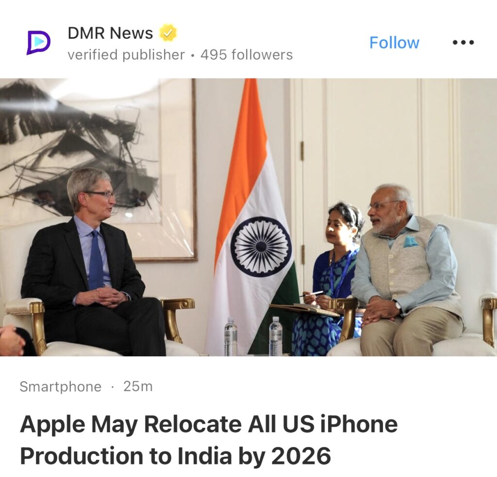 9。据DMR News报道,苹果或将在 2026 年之前将所有美国 iPhone 生产迁至印度。