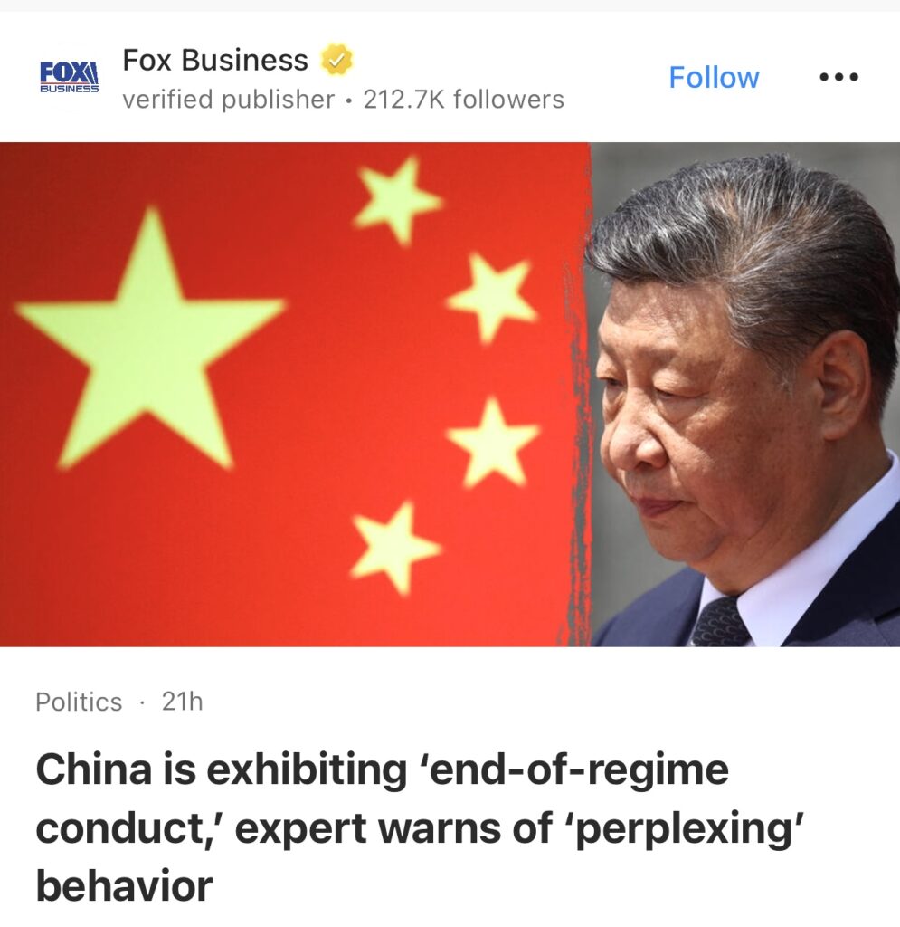 6。据Fox Business报道,中国正在展现“政权终结行为”,专家警告称其行为“令人困惑”。外交政策专家章家敦(Gordon Chang)表示,目前北京的情况“非常非常不对劲”。