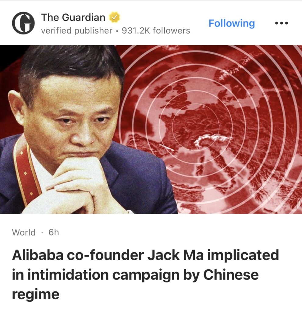 5。据The Guardian报道,阿里巴巴联合创始人马云涉嫌参与中国政权的恐吓活动。