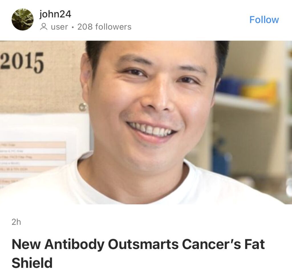 8。据John24报道,癌症的诡计是什么?它会构建一层脂肪屏障,关闭免疫细胞。但科学家们刚刚研发出一种名为PLT012的抗体,它可以阻断这层脂肪屏障,让免疫系统再次发起攻击——即使是对那些难以治疗的肝癌也是如此。它本质上就是重启免疫细胞,让它们能够反击。