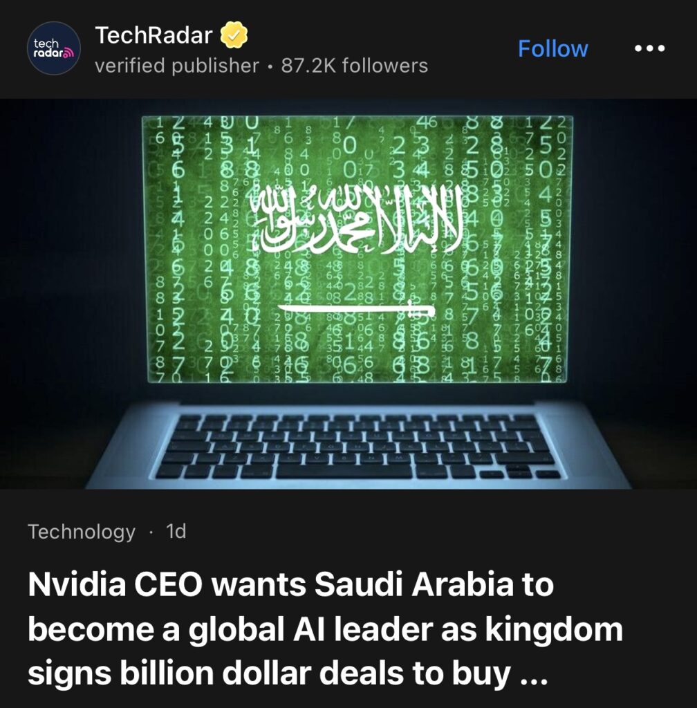 7。据TechRadar 报道,Nvidia 首席执行官希望沙特阿拉伯成为全球人工智能领导者,因为沙特阿拉伯签署了数十亿美元的协议,到 2030 年购买数十万 GB300 超级芯片。