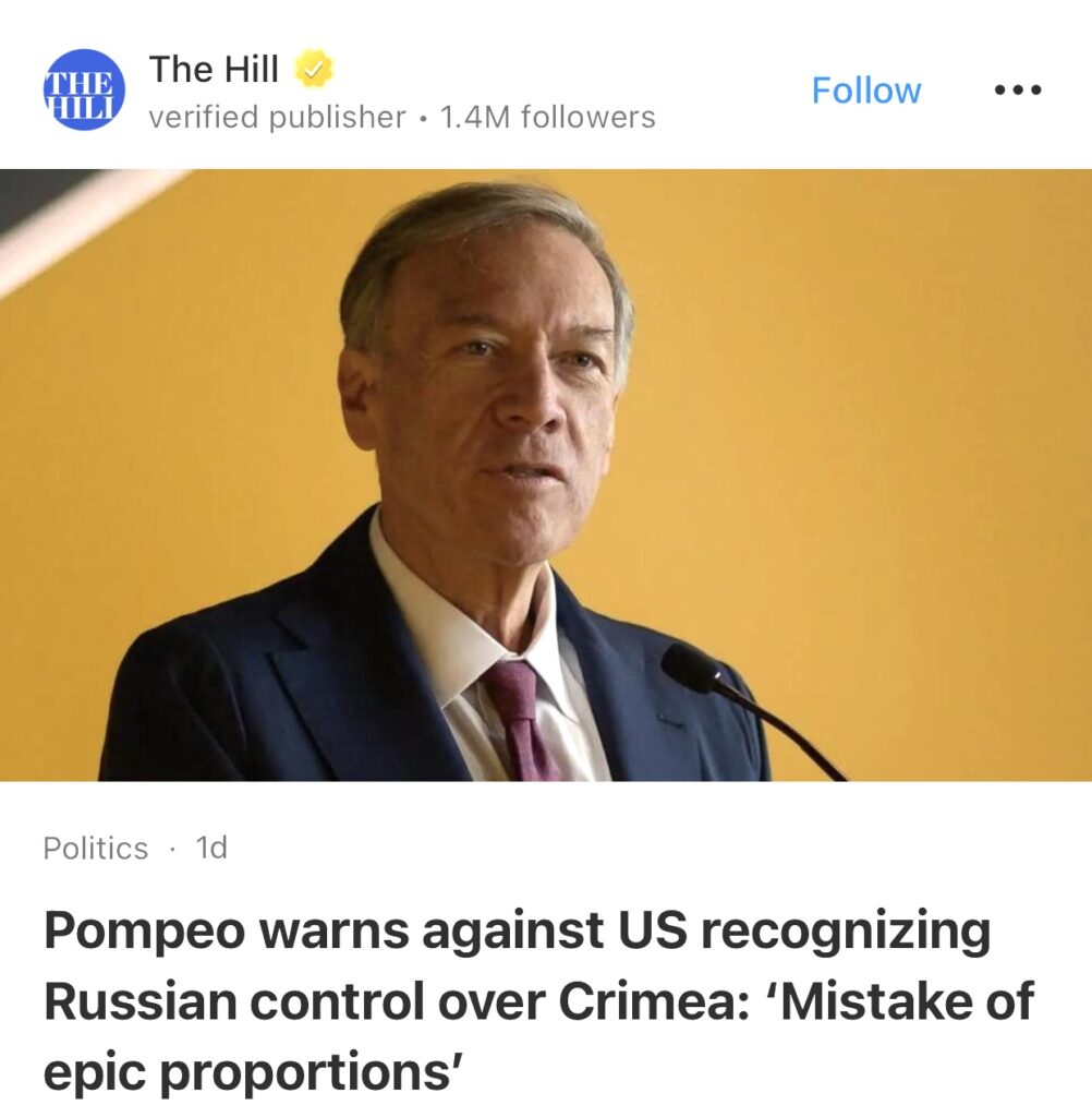 14。据The Hill报道,乌克兰敖德萨——在俄罗斯从乌克兰占领的克里米亚半岛发射的火箭弹射程内,前国务卿迈克·蓬佩奥站在敖德萨,呼吁特朗普总统拒绝承认俄罗斯对其以武力夺取的领土的主权。