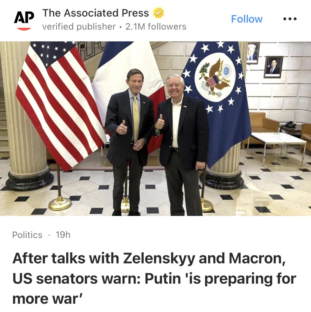 1。巴黎(美联社)——两名美国资深参议员周日警告称,俄罗斯总统普京正在和平谈判桌上拖延时间,同时准备对乌克兰发动新一轮军事进攻。他们认为,未来两周可能会决定这场战争的未来,这场战争已经摧毁了城市,导致数百万人流离失所,并改写了欧洲的安全版图。
