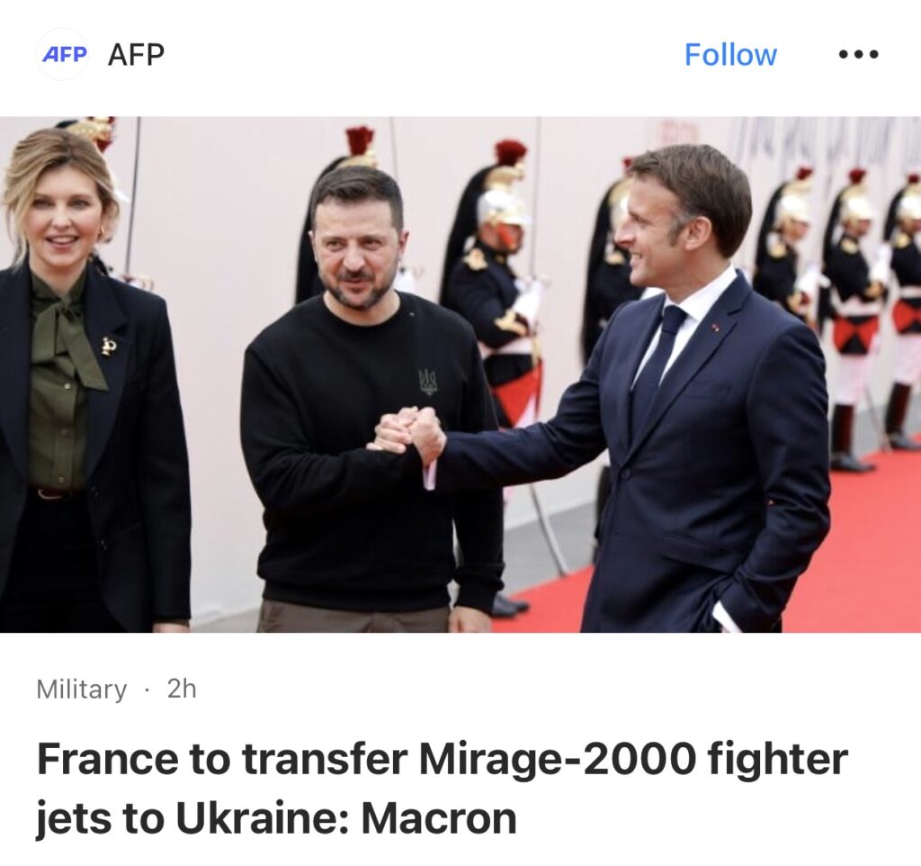 11。据AFP报道,法国总统马克龙周四宣布,法国将向乌克兰转让幻影2000战斗机,并培训乌克兰飞行员,作为与基辅抗击俄罗斯入侵的新军事合作的一部分。