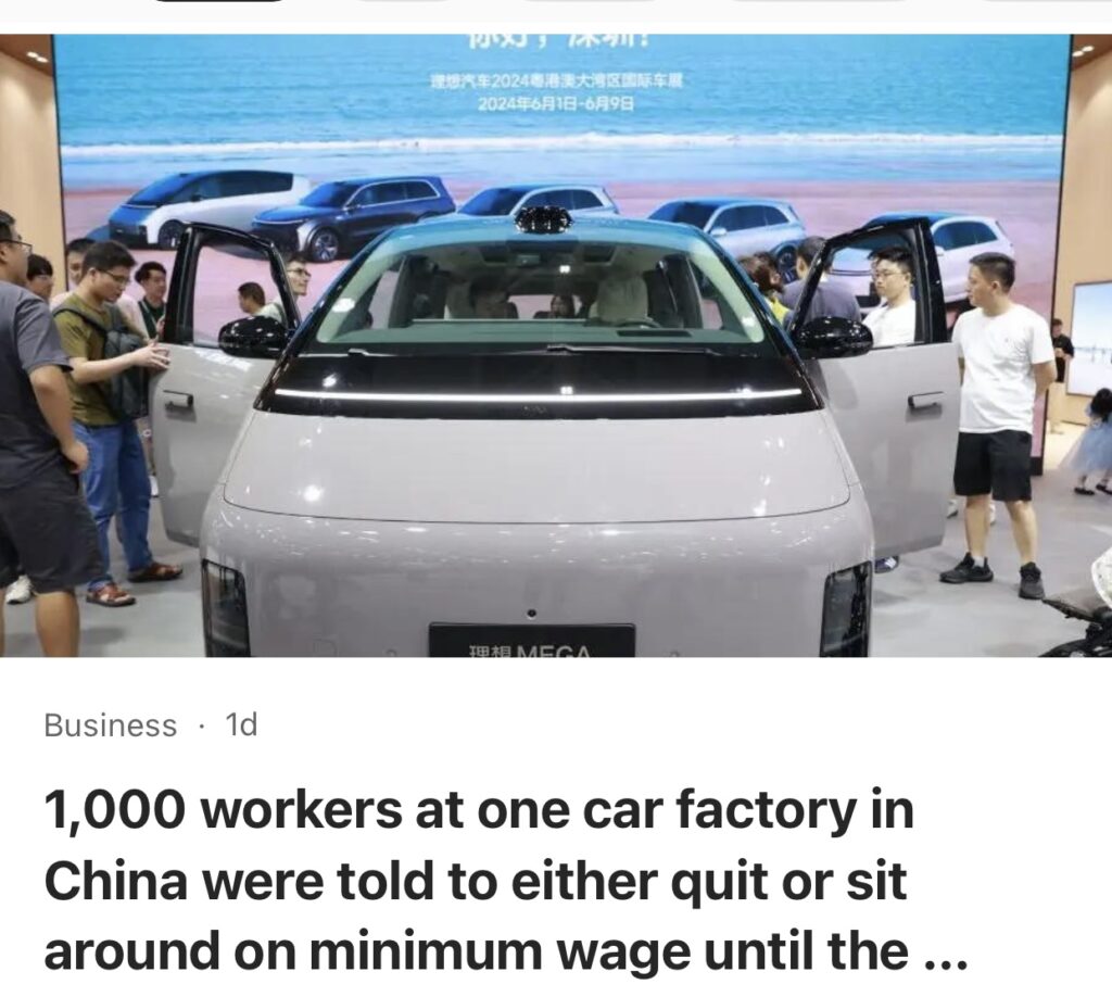 5。据Business Insider报道,理想汽车的 1,000 名工人被告知要么辞职,要么继续领取最低工资,直到市场再次回暖。中国汽车行业正面临生产过剩的困境,影响着国内和国际市场。随着中国电动汽车制造商寻求新市场,西方对补贴和产能过剩的担忧增加了压力。