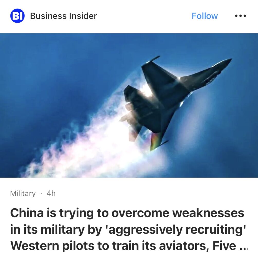 4。据Business Insider报道,五眼情报盟友警告说,中国正试图通过“积极招募”西方飞行员来训练其飞行员来克服其军事弱点。