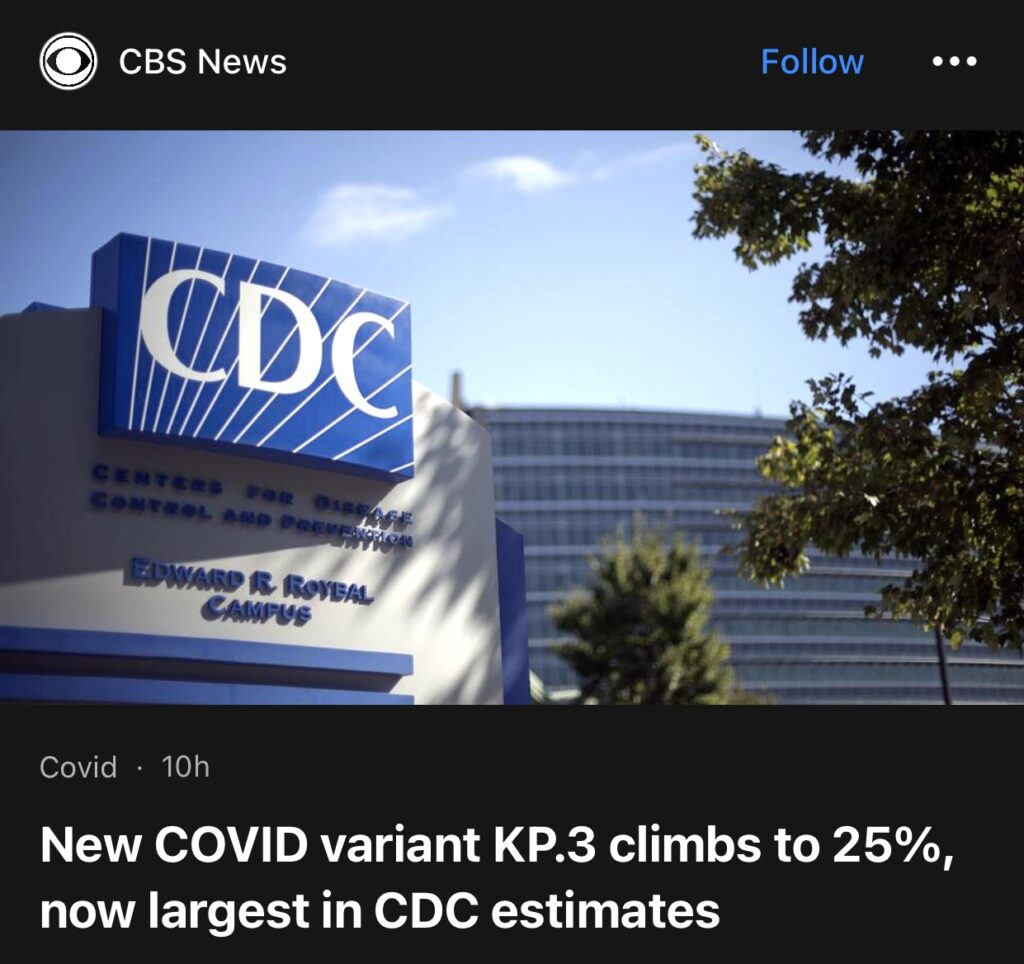 4。据CBS News报道,美国疾病控制与预防中心周五估计,新冠新的 KP.3 变种已攀升至全美新发 COVID-19 病例的四分之一,使其成为全国病毒的主要毒株。