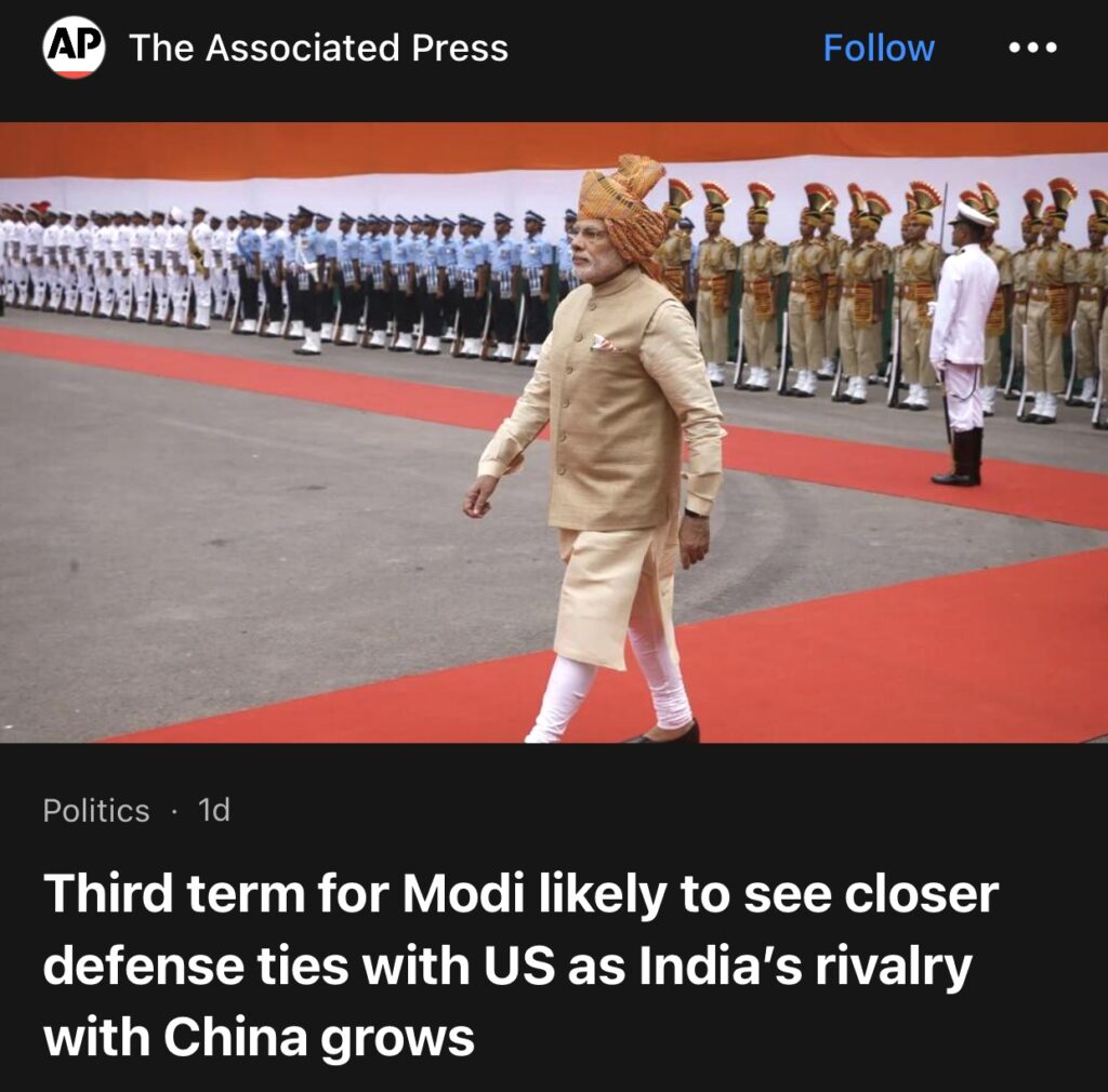 9。据新德里美联社报道,刚刚宣布印度大选胜利的印度总理纳伦德拉·莫迪,并未透露其第三个任期的议程细节,但特意强调他将继续专注于提高该国的军事准备和影响力。