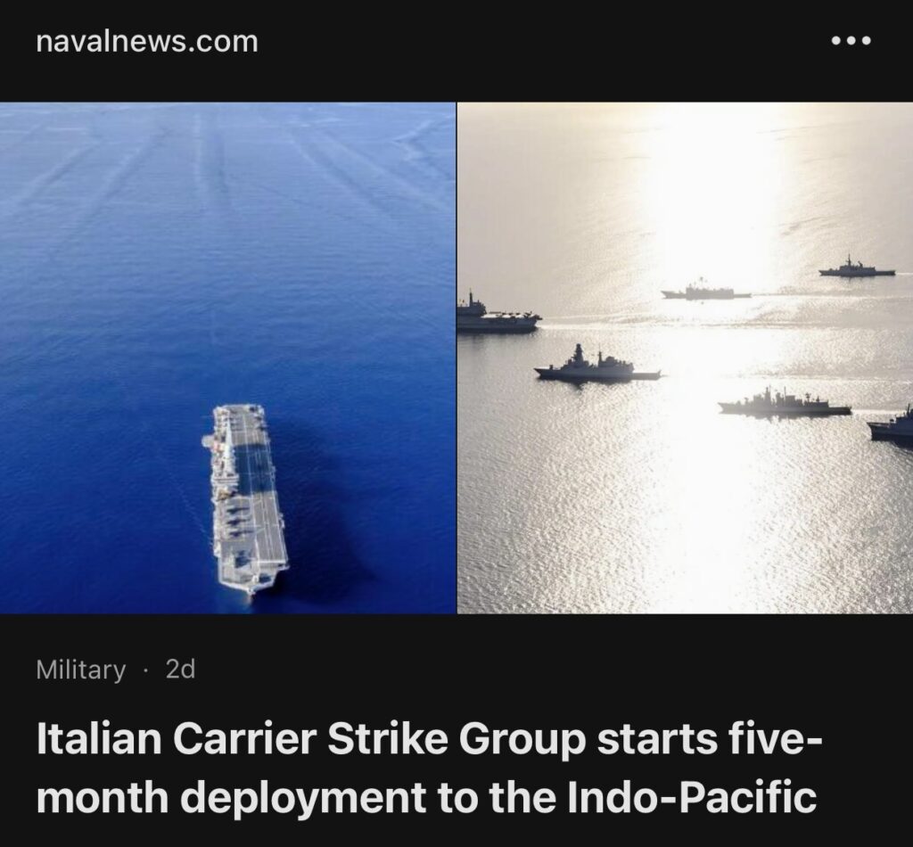 6。据Naval News报道,意大利航母战斗群开始在印度太平洋地区进行为期五个月的部署。以加富尔 (CVH 550) STOVL 航空母舰为基础的意大利海军航母战斗群,由阿尔皮诺 (F 594) 贝尔加米尼级护卫舰护航,已于 6 月 1 日离开塔兰托海军基地,开始在印度-太平洋地区进行为期五个月的作战行动地区。
