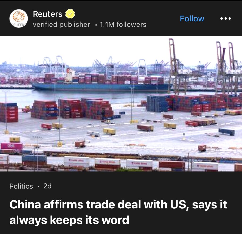 15。北京(路透社)——中国周四确认了美国总统唐纳德·特朗普宣布的一项贸易协议,并表示双方需要遵守共识,并补充说中国始终信守承诺。这项协议是在特朗普与中国国家主席习近平上周通电话后达成的,为世界两大经济体之间的贸易战带来了微妙的休战。