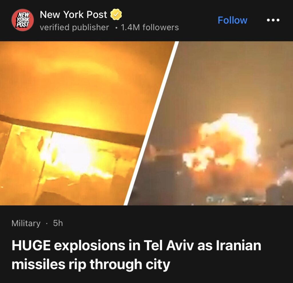 6。据New York Post报道,伊朗导弹袭击特拉维夫,引发巨大爆炸。