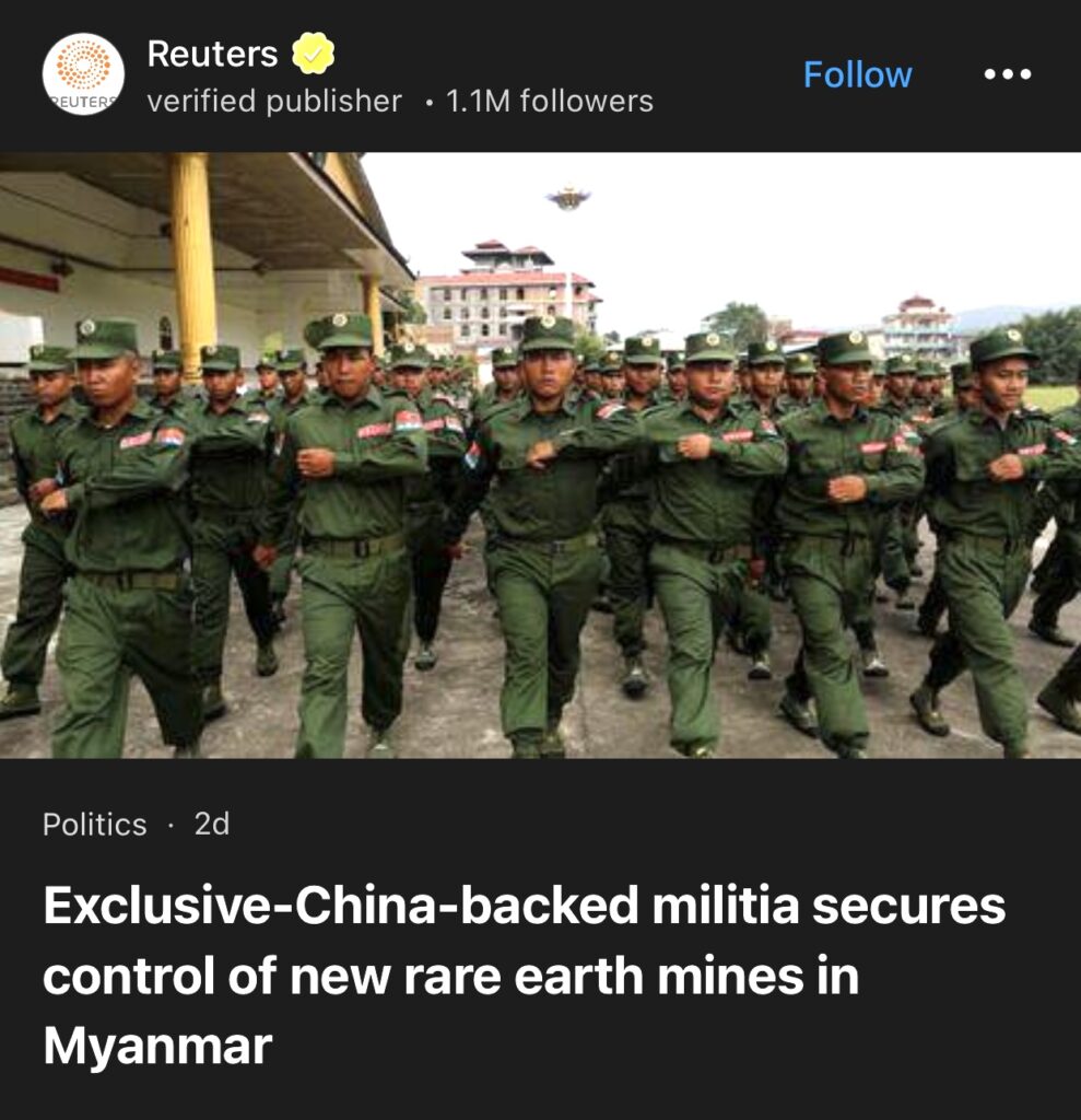 7。据Reuters独家报道,中国支持的民兵组织控制缅甸新稀土矿。
