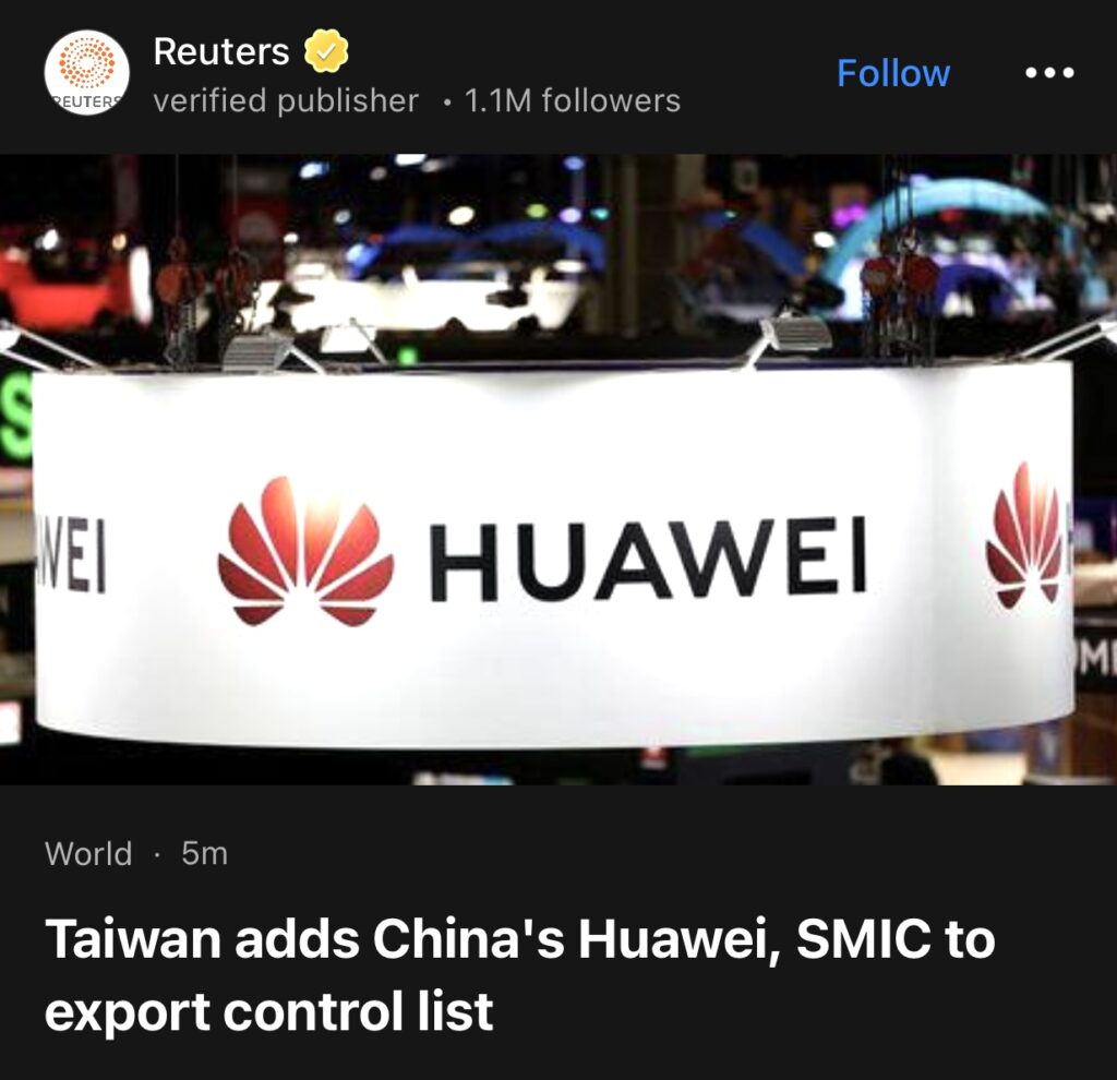14。台北(路透社)——台湾政府已将中国华为技术有限公司和中芯国际列入出口管制名单,该名单还包括塔利班和基地组织等其他被禁组织。