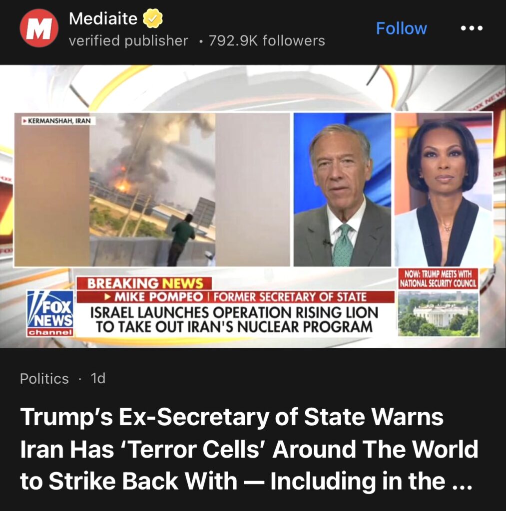 5。据Mediaite报道,特朗普的前国务卿警告称,伊朗在世界各地都有“恐怖组织”可供反击——包括在美国境内。