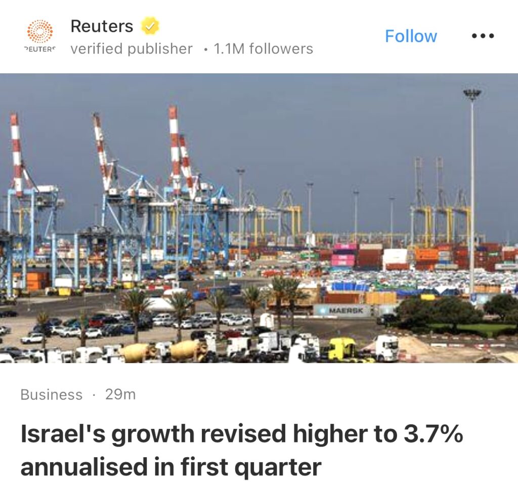 5。耶路撒冷(路透社)——以色列中央统计局周日表示,受出口和投资推动,以色列第一季度经济增长超过此前预期,但加沙地带针对巴勒斯坦伊斯兰组织哈马斯的战争继续影响经济增长。