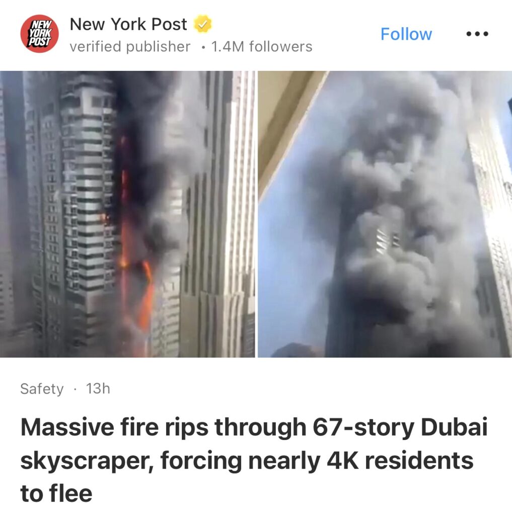 1。据New York Post报道,迪拜 67 层摩天大楼发生大火,迫使近 4000 名居民撤离。