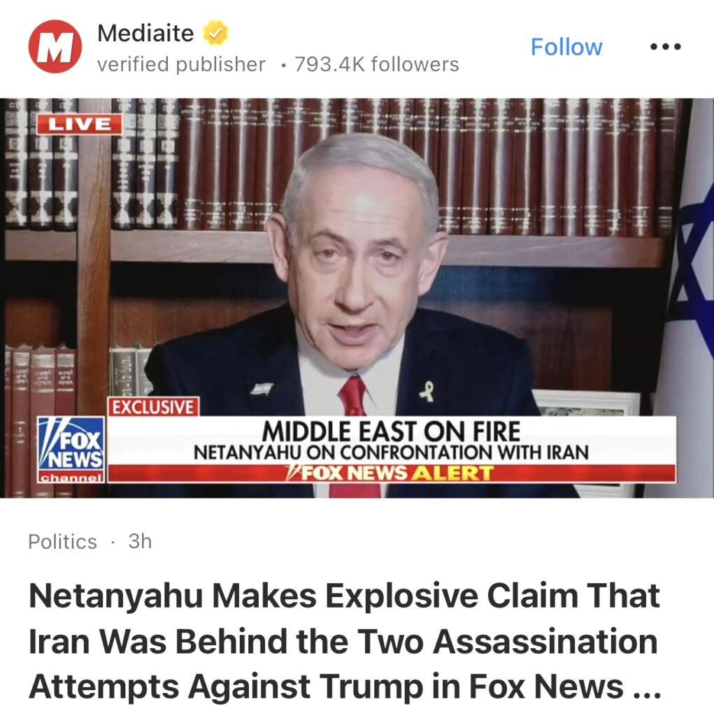 2。据Mediaite报道,内塔尼亚胡在福克斯新闻采访中声称伊朗是两次针对特朗普的暗杀事件的幕后黑手。