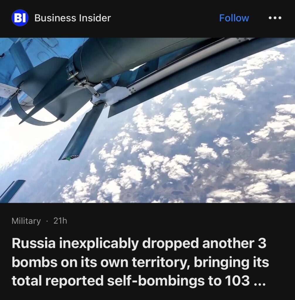 1。据Business Insider报道,俄罗斯莫名其妙地在自己领土上又投掷了 3 枚炸弹,使今年报告的自爆事件总数达到 103 起。