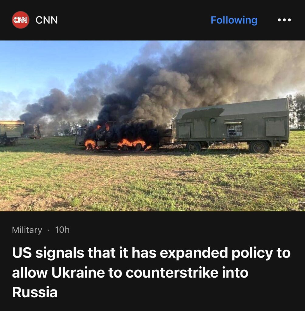 9。据CNN报道,美国表示已扩大政策,允许乌克兰反击至俄罗斯本土。