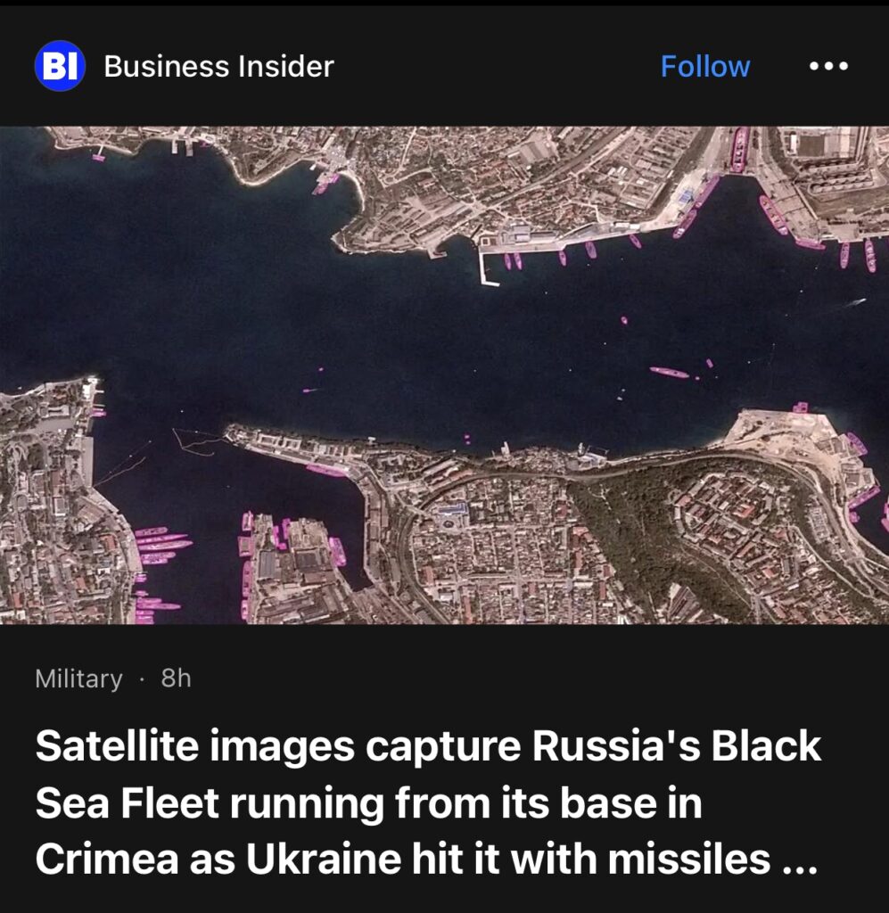 7。据Business Insider报道,卫星图像捕捉到俄罗斯黑海舰队,因乌克兰用导弹和爆炸的无人机袭击,从克里米亚基地撤离。