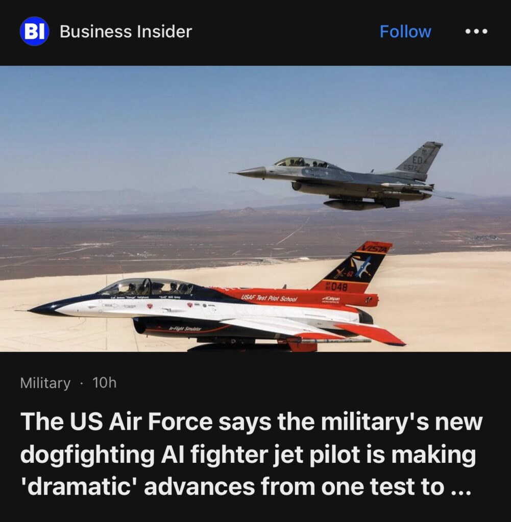 10。据Business Insider报道,美国空军表示,军方新的空战人工智能战斗机飞行员,正在从一项测试到下一项测试,并取得“巨大”进步。