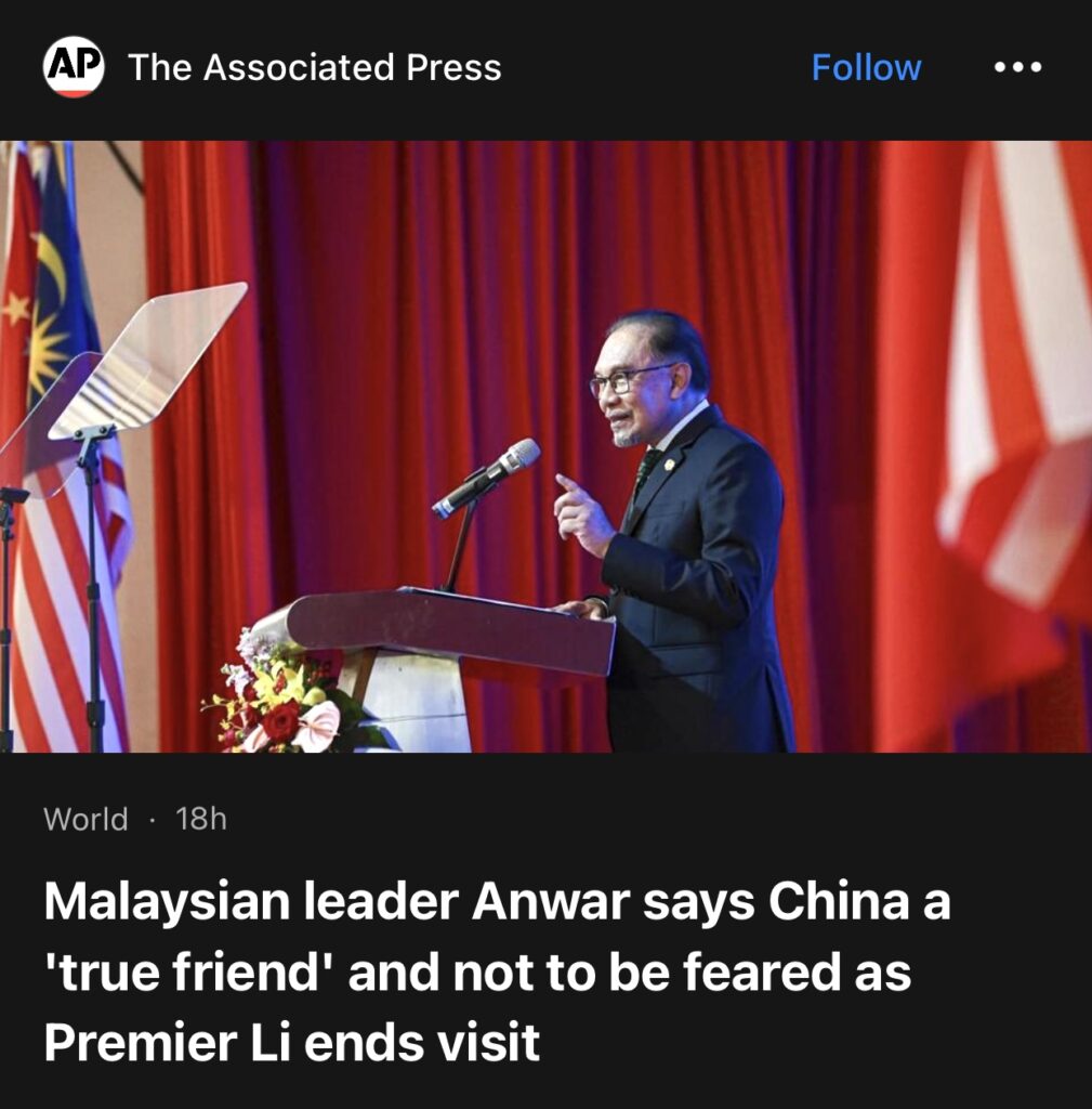 2。据马来西亚吉隆坡美联社报道,周四,马来西亚总理安瓦尔·易卜拉欣在李强总理访问,以纪念两国建交50周年之际,驳斥了中国主导地位令人担忧的观点,称中国是“真正的朋友”。