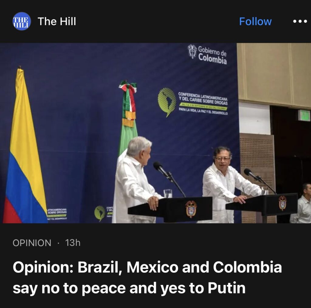 6。据The Hill报道,俄罗斯对乌克兰的入侵严重侵犯了主权和国际法。国际刑事法院认为,俄罗斯犯下了反人类罪。但这对墨西哥和巴西来说似乎无关紧要。安德烈斯·曼努埃尔·洛佩斯·奥夫拉多尔总统和卢拉·达席尔瓦总统联手全力支持乌克兰的侵略者,并对最新的和平宣言说不。