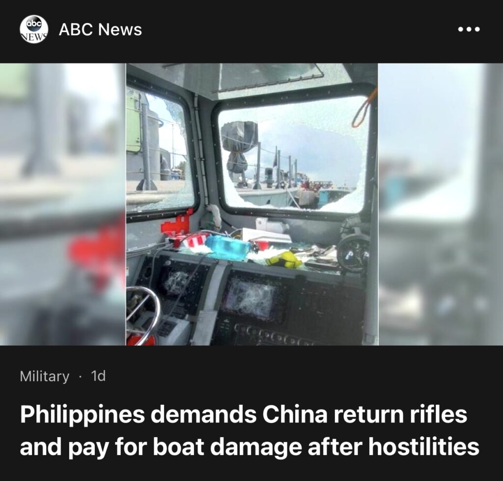 13。据ABCNews 报道,菲律宾要求中国在争议海域发生敌对行动后,归还步枪并赔偿损坏的船只。