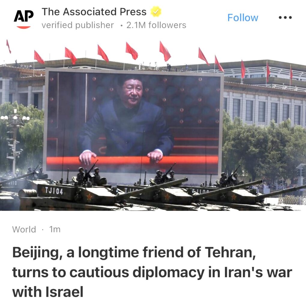 1。据The Associated Press报道,北京是德黑兰的长期朋友,但在伊朗与以色列的战争中采取了谨慎的外交政策。
