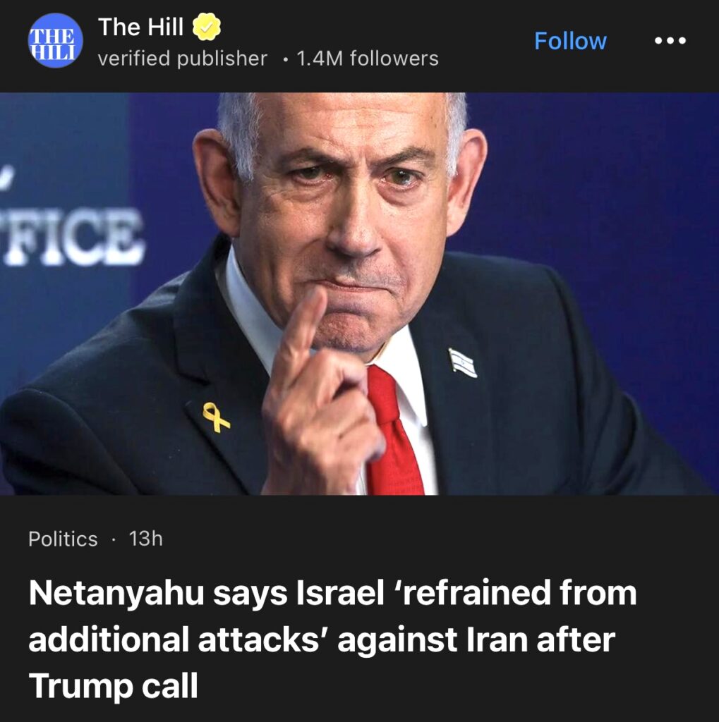 7。据The Hill报道,内塔尼亚胡称,特朗普致电后以色列“不再对伊朗发动进一步袭击”。