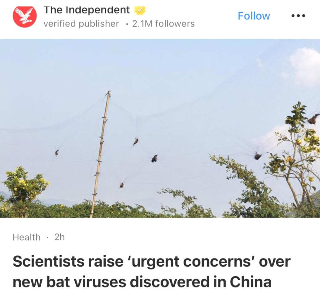 13。据The Independent报道,在中国发现两种可能感染人类并导致严重脑炎和呼吸系统疾病的新型蝙蝠病毒后,研究人员提出了“紧急担忧”。