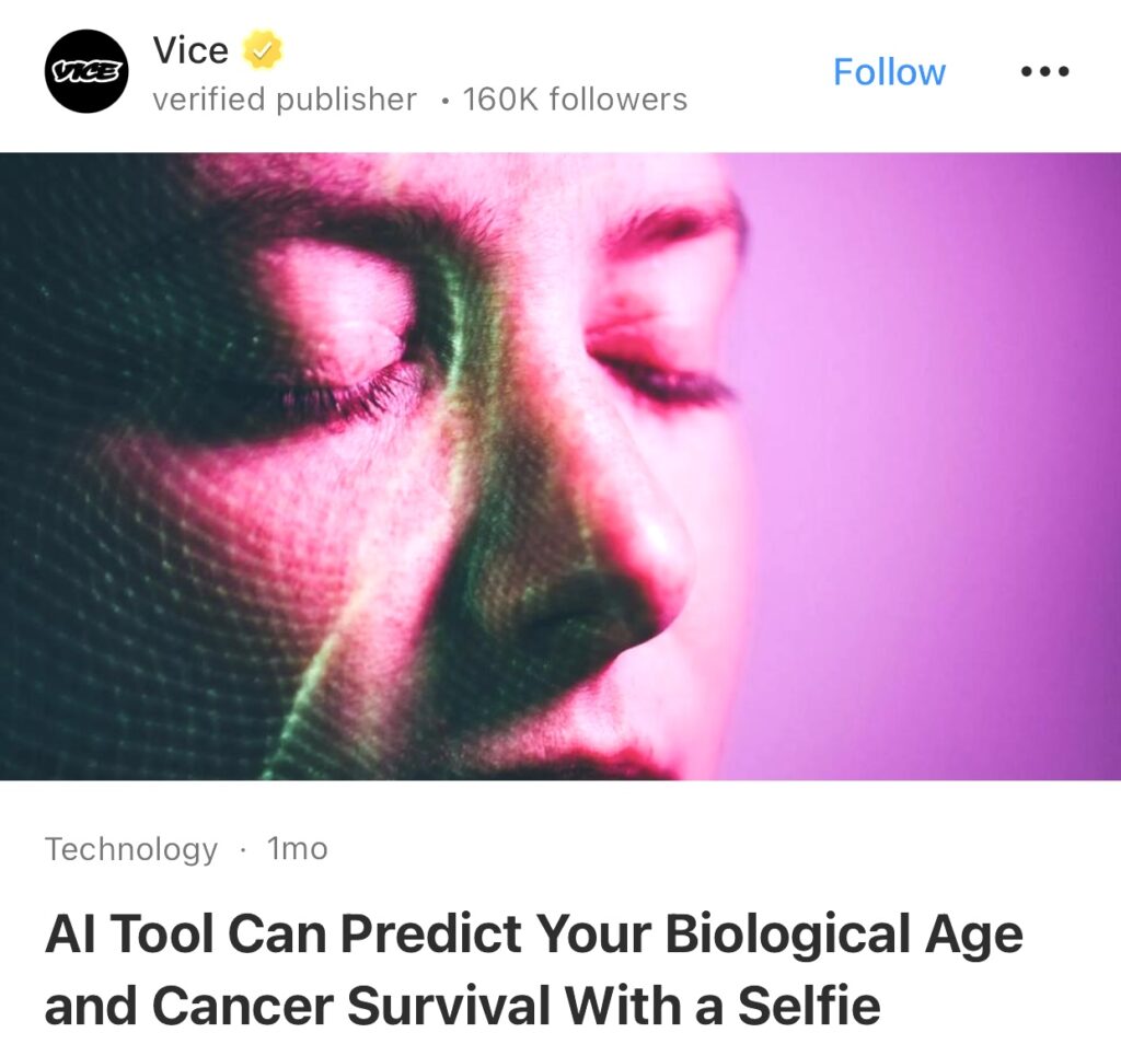 15。据Vice报道,人工智能工具可以通过自拍照预测你的生物年龄和癌症生存率。麻省总医院布莱根分校的科学家开发了一种名为 FaceAge 的人工智能模型,他们声称该模型可以通过观察你的脸部来估算你的“生物年龄”,或者根据你的经历估算你的细胞年龄,这可能与你的驾照上列出的年龄有很大差异。