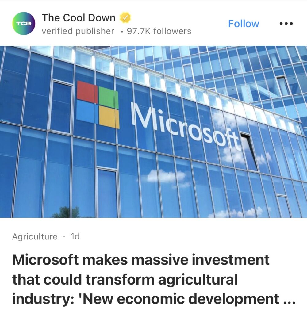 14。据The Cool Down报道,微软大规模投资或将改变农业产业,是 ”新的经济发展机遇”。