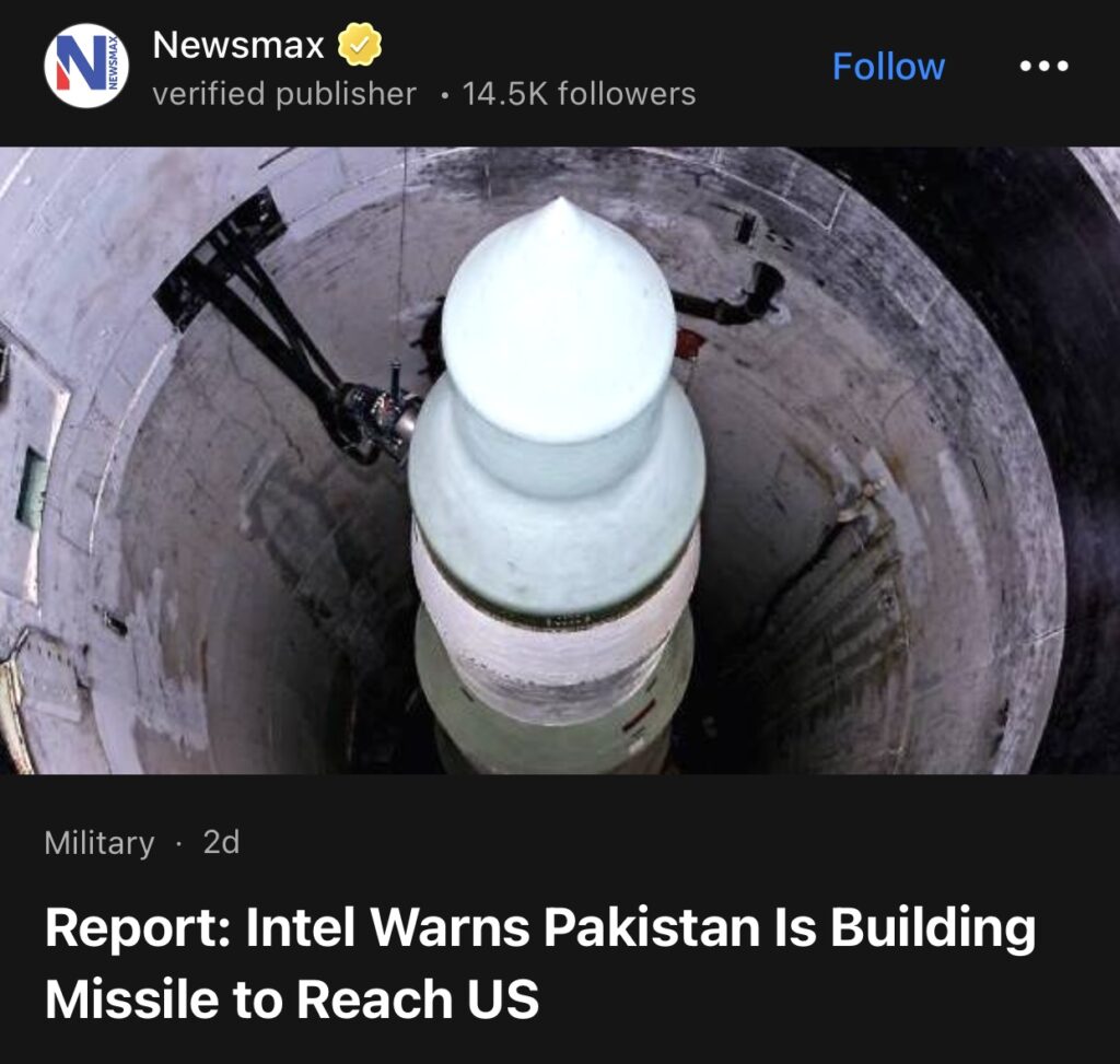 4。据Newsmax报道,英特尔警告巴基斯坦正在研制射向美国的导弹。