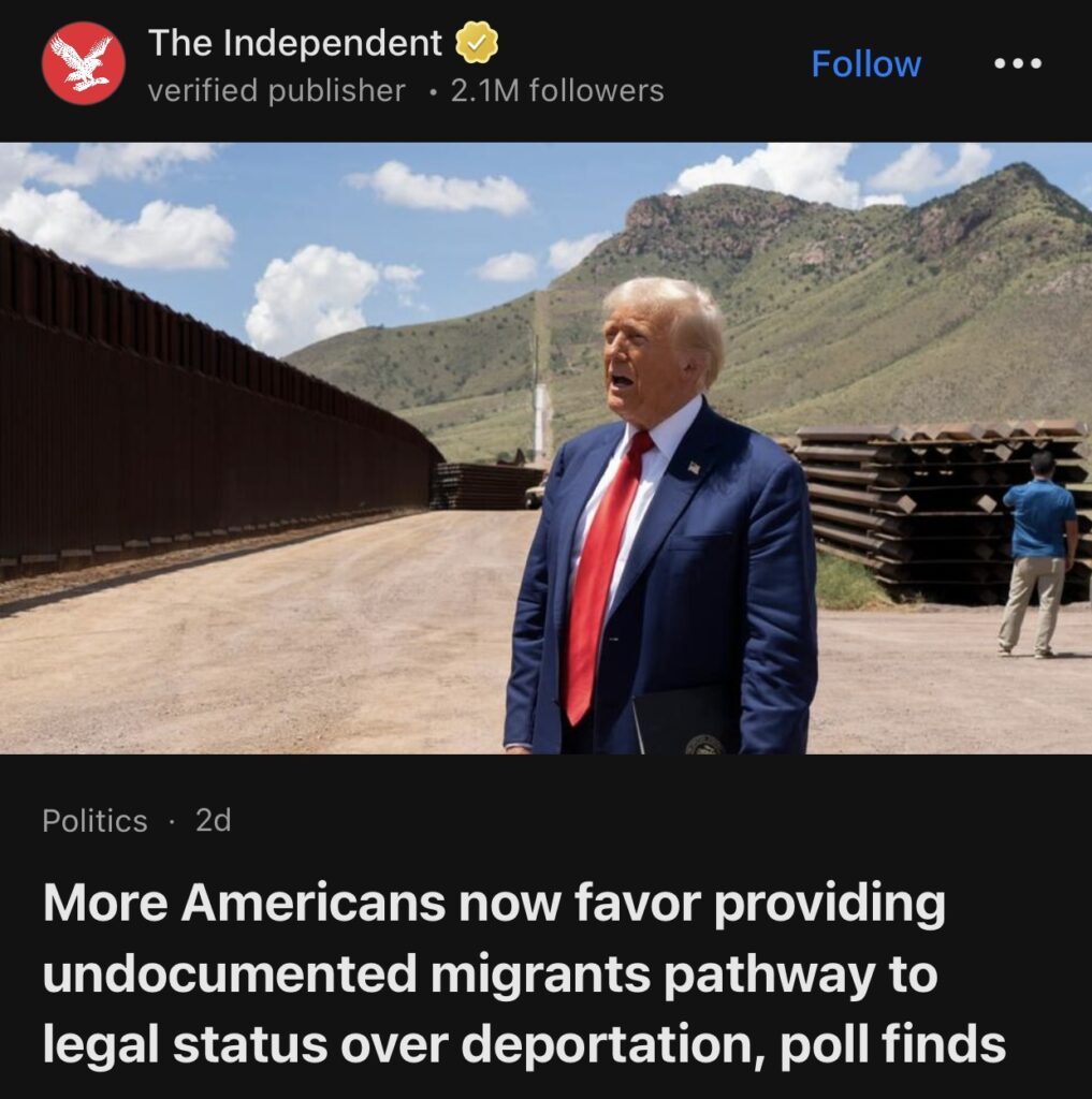 3。据The Independent报道,民意调查发现,更多美国人现在支持为无证移民提供获得合法身份的途径,而不是驱逐出境。