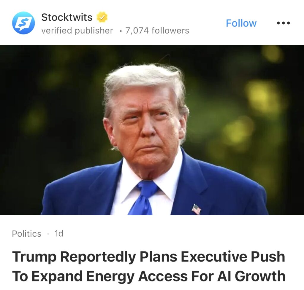 12。据Stocktwits报道,特朗普计划大力推动扩大能源供应,促进人工智能发展。