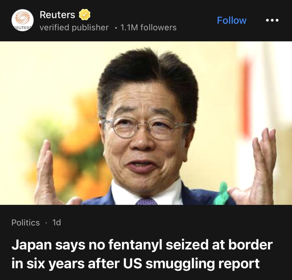 7。东京(路透社)——日本财务大臣加藤胜信周五表示,截至 2024 年的六年内,日本边境没有查获任何芬太尼。此前有媒体报道称,日本的一个中国团体将化学品走私到美国用于制造这种合成药物。