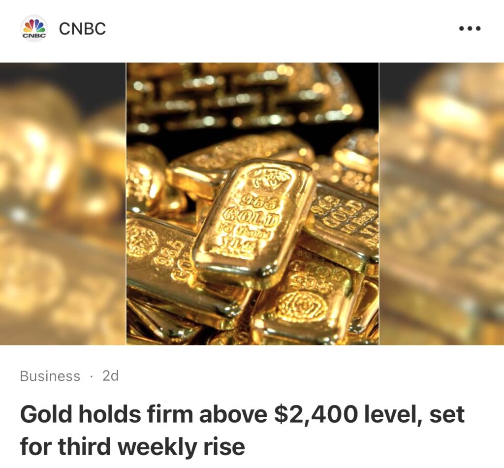 10。据CNBC 报道,金价坚守 2,400 美元,预料将连续第三周上涨。