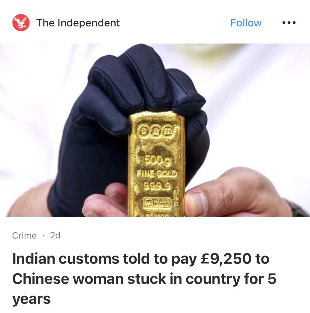 12。据The Independent报道,印度一家法院命令海关部门向一名自 2019 年被错误逮捕,滞留在印度的中国妇女支付 100 万卢比(合 9,250 英镑)的赔偿金。法院称,海关官员的行为是“错误的、报复性的、应受谴责的”,相当于“严重滥用职权”。