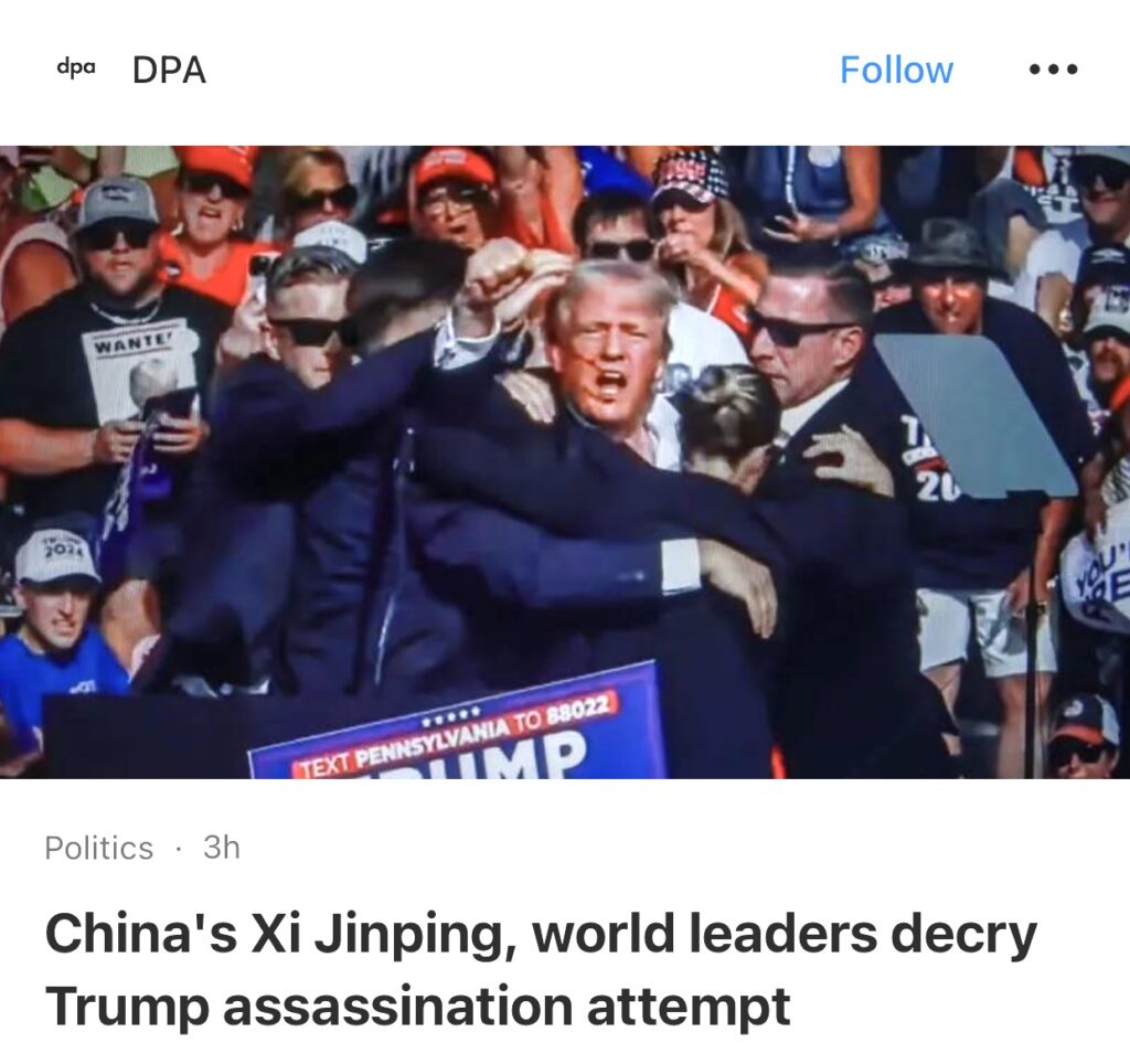 14。据DPA 报道,中国领导人习近平和世界领导人谴责周六对特朗普的暗杀。