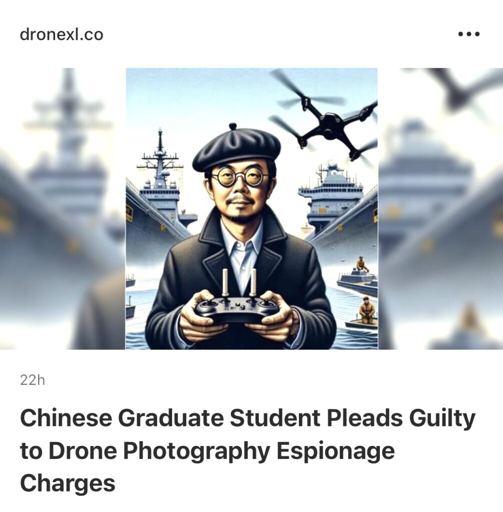 3。据Drone lx报道,中国研究生石风云承认了根据《间谍法》使用无人机拍摄美国海军机密舰艇的指控。据 The Verge 报道,这是根据二战时期禁止飞机对敏感军事地点进行摄影的法规首次被定罪。