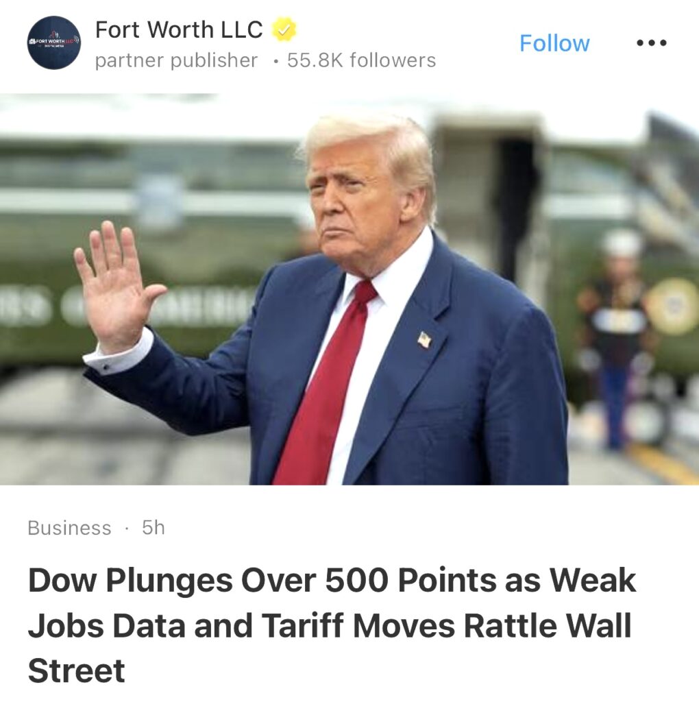 12。据Fort Worth LLC报道,疲软就业数据和关税举措令华尔街动荡,道琼斯指数暴跌逾500点。