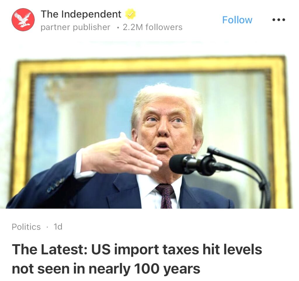 14。据The Independent报道,最新消息称,美国进口税达到近百年来最高水平。