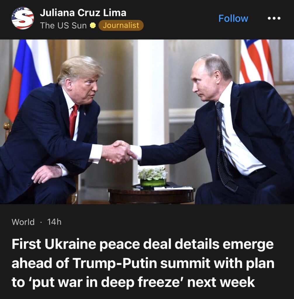 4。据The US Sun报道,特朗普与普京峰会前夕,乌克兰首份和平协议细节曝光,计划下周“深度冻结战争”。